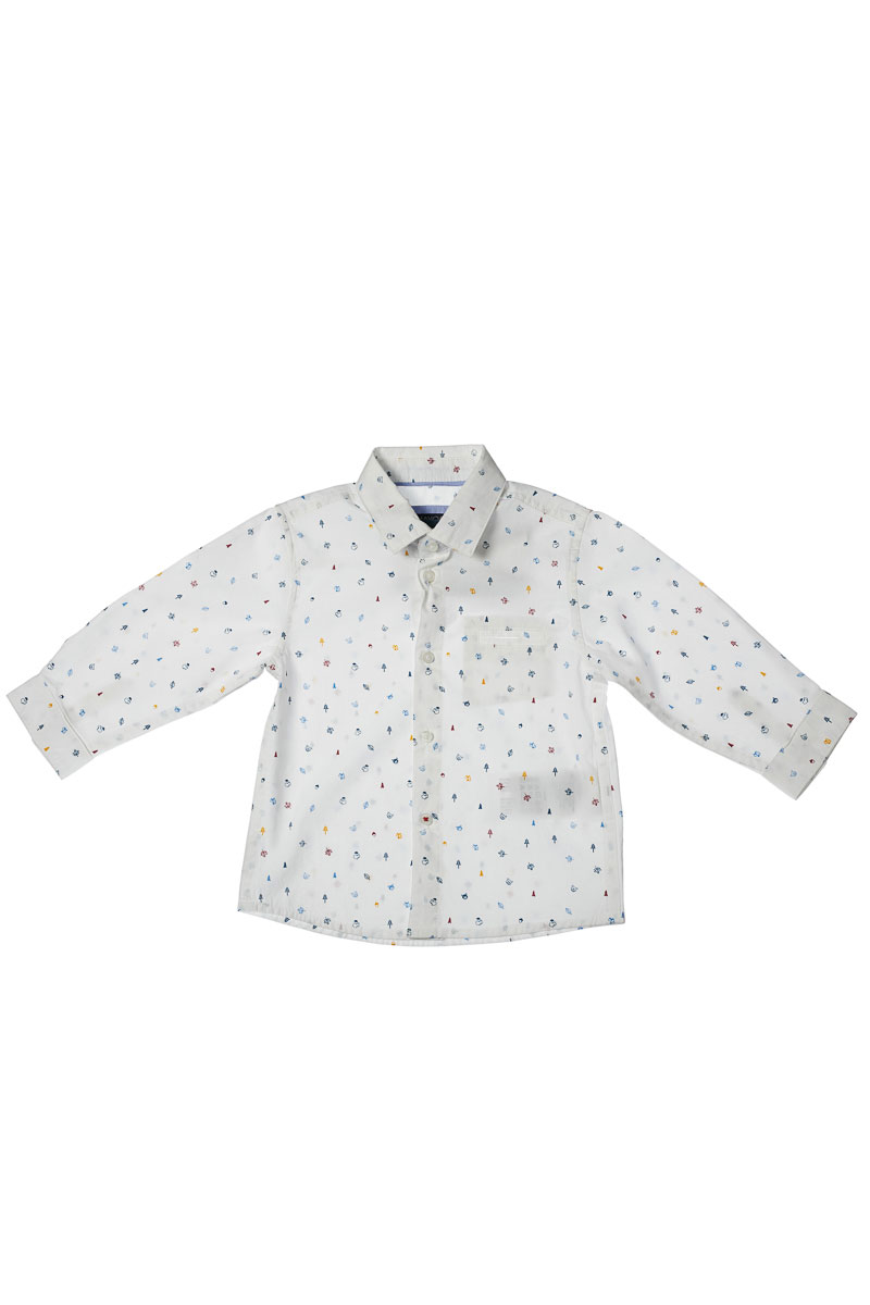 Camasa baieti alba cu desene, inchidere cu nasturi.