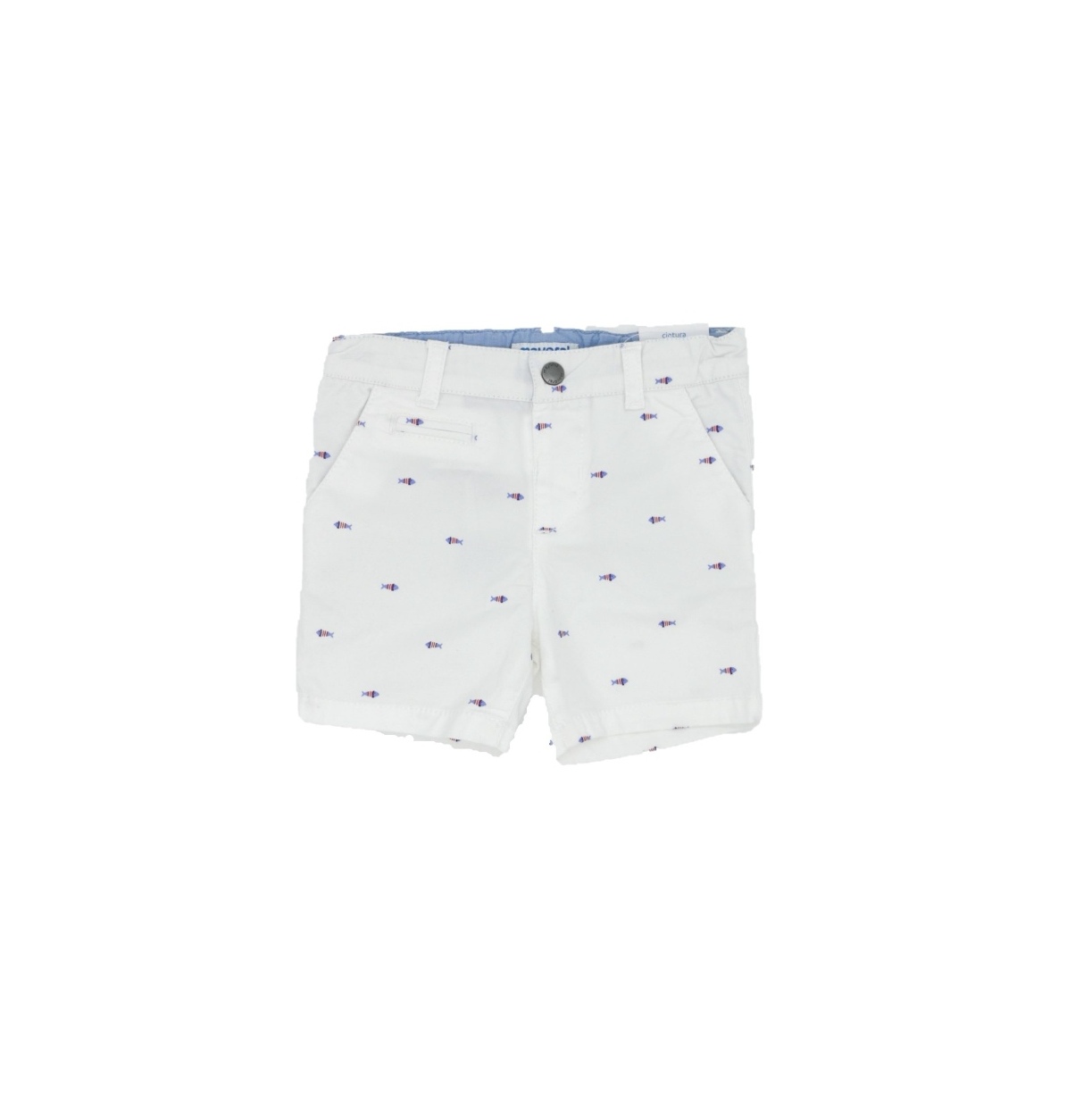 Culoare alba cu imprimeu pestisori colorati.